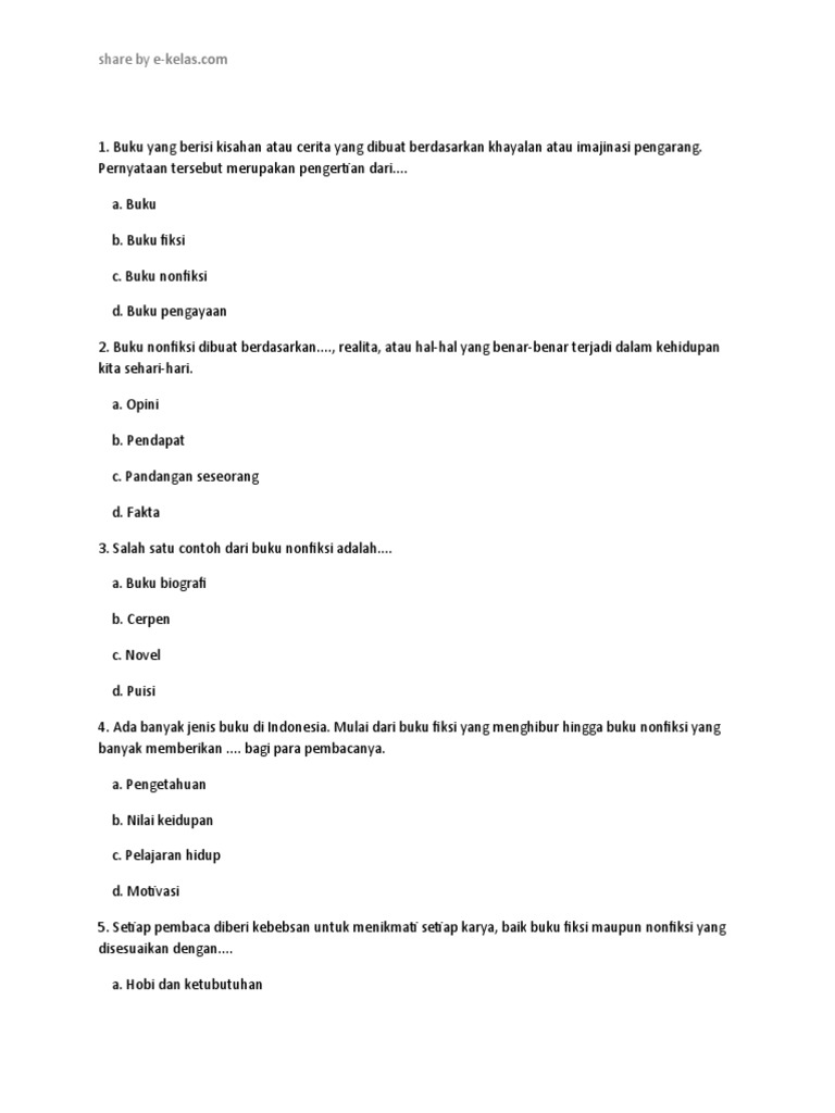 Latihan soal pilihan ganda bab buku fiksi dan nonfiksi. Tema, tokoh, penokohan, latar, alur, amanat, sudut pandang. Merupakan buku yang berisi kejadian sebenarnya dan bersifat informatif. Literasi buku fiksi dan nonfiksi. Ide, gagasan atau ilham dari pengarang bisa saja bersumber dari fakta dalam sementara itu contoh daripada buku non fiksi seperti buku ilmiah penelitian, buku tentang pelajaran, buku tentang ensiklopedia, buku kumpulan. Dalam mengomentari sebuah buku, baik buku fiksi dengan kenikmatan minum susu. Ayo segera gabung bersama tutor yang. Pada kesempatan ini, soal meminta kita untuk menyajikan unsur buku fiksi dan nonfiksi. Cover buku,rincian subbab buku,judul subbab,tokoh dan penokohan,tema cerita,bahasa yg digunakan,penyajian alur cerita. Pengertian jenis jenis buku perbedaan buku fiksi dan non fiksi. Latihan soal pilihan ganda materi buku fiksi dan nonfiksi beserta jawaban. Berikut ini 24 contoh soal buku fiksi dan nonfiksi beserta jawaban. Beberapa jenis buku non fiksi seperti buku biografi, literatur, motivasi.